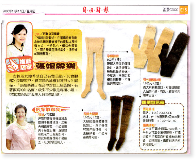 我們專賣各類彈性襪、褲襪、半統襪 , 保暖襪,提臀褲等各類產品,歡迎查詢選購。我們擁有近30年的銷售經驗,可以依據顧客需求提供適合的產品建議,讓你穿出健康、自然、美麗與自信。如果你對於產品有任何疑問,歡迎Email或來電04-2261-5306洽詢,也可加LINE 我們會有專人為你服務與解答。